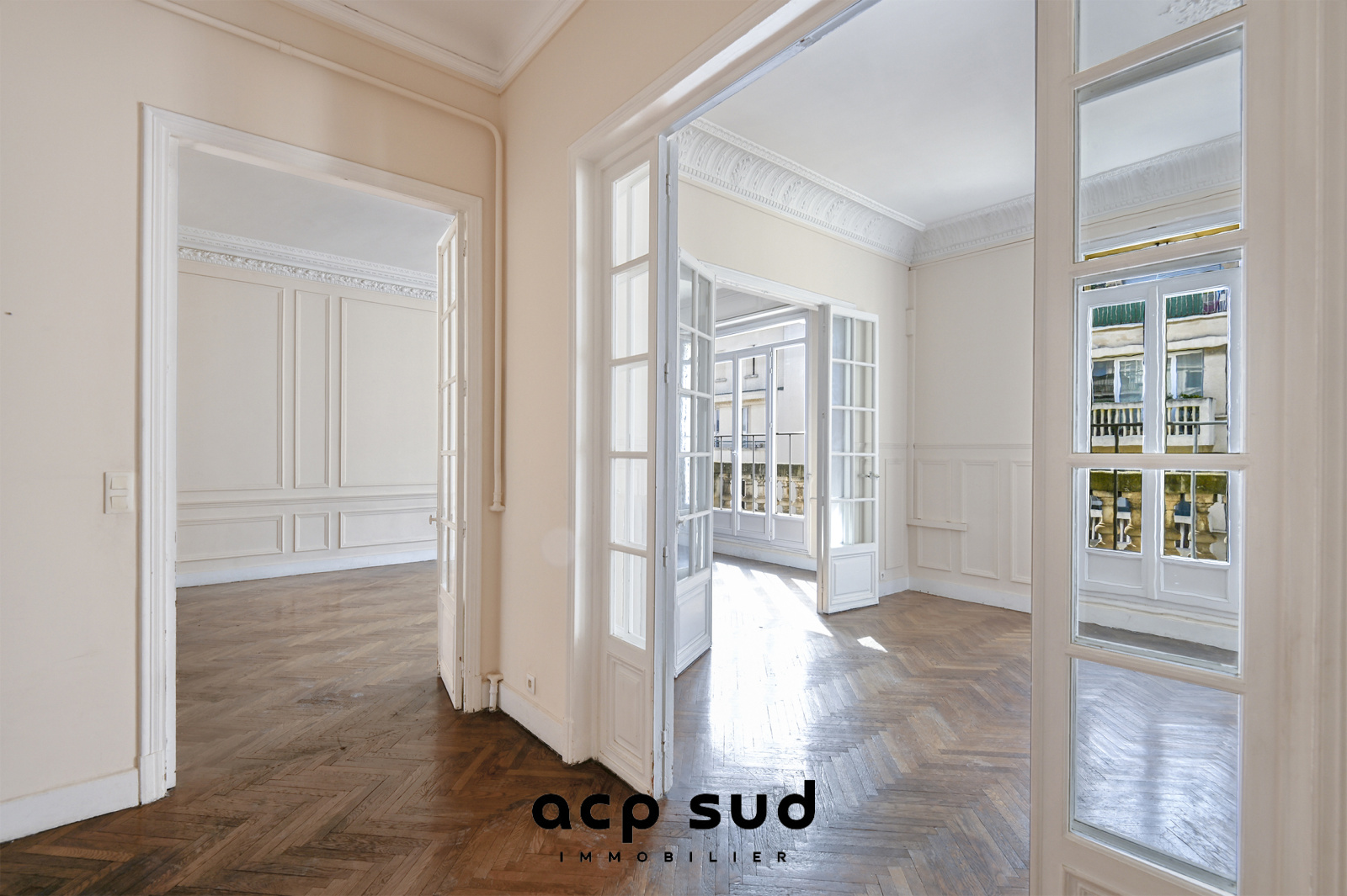 L’espace de vie de 60m2 baigné de lumière (expo ouest) séduit immédiatement par ses volumes et son parquet, soulignant l’élégance des lieux.