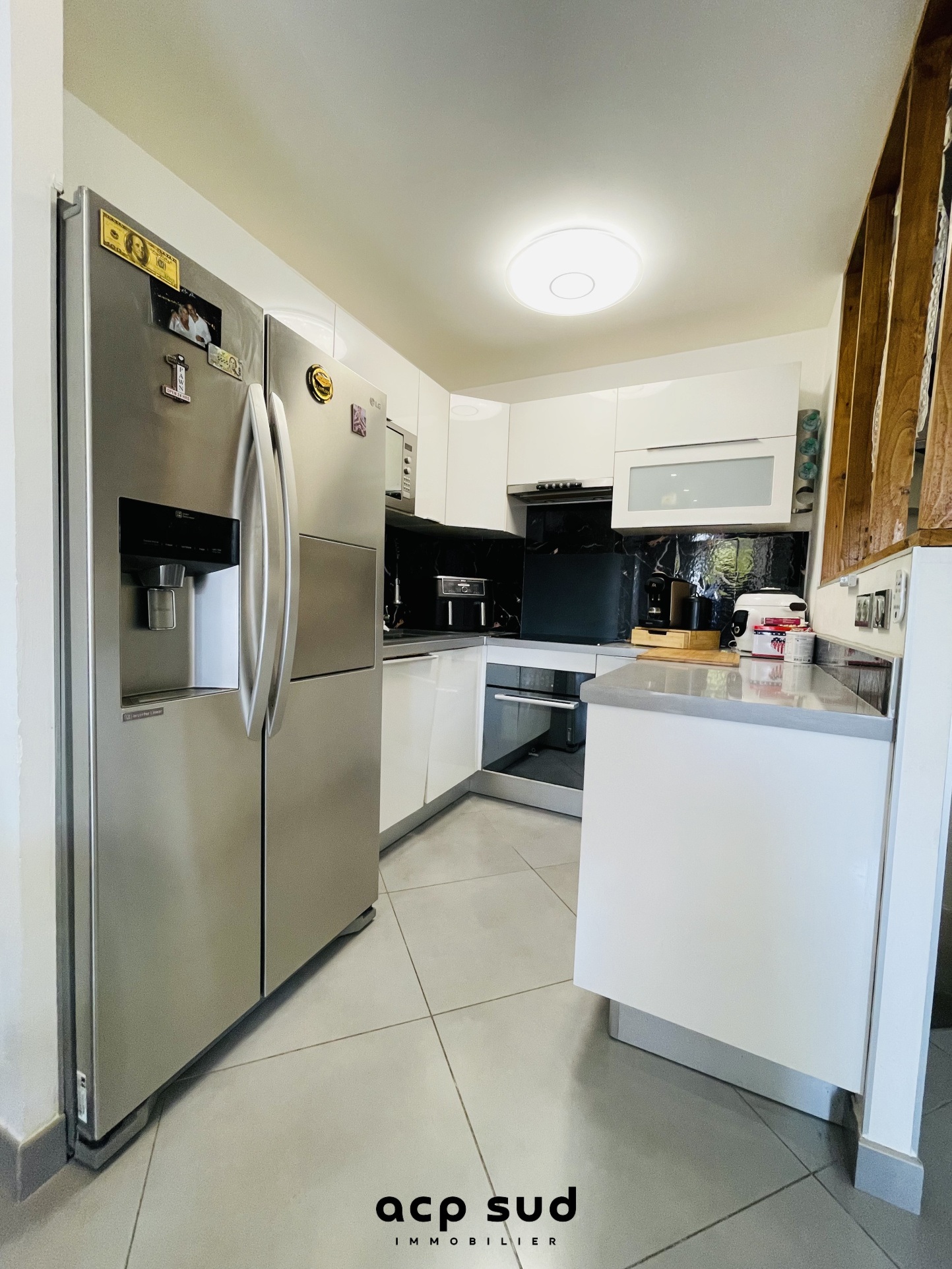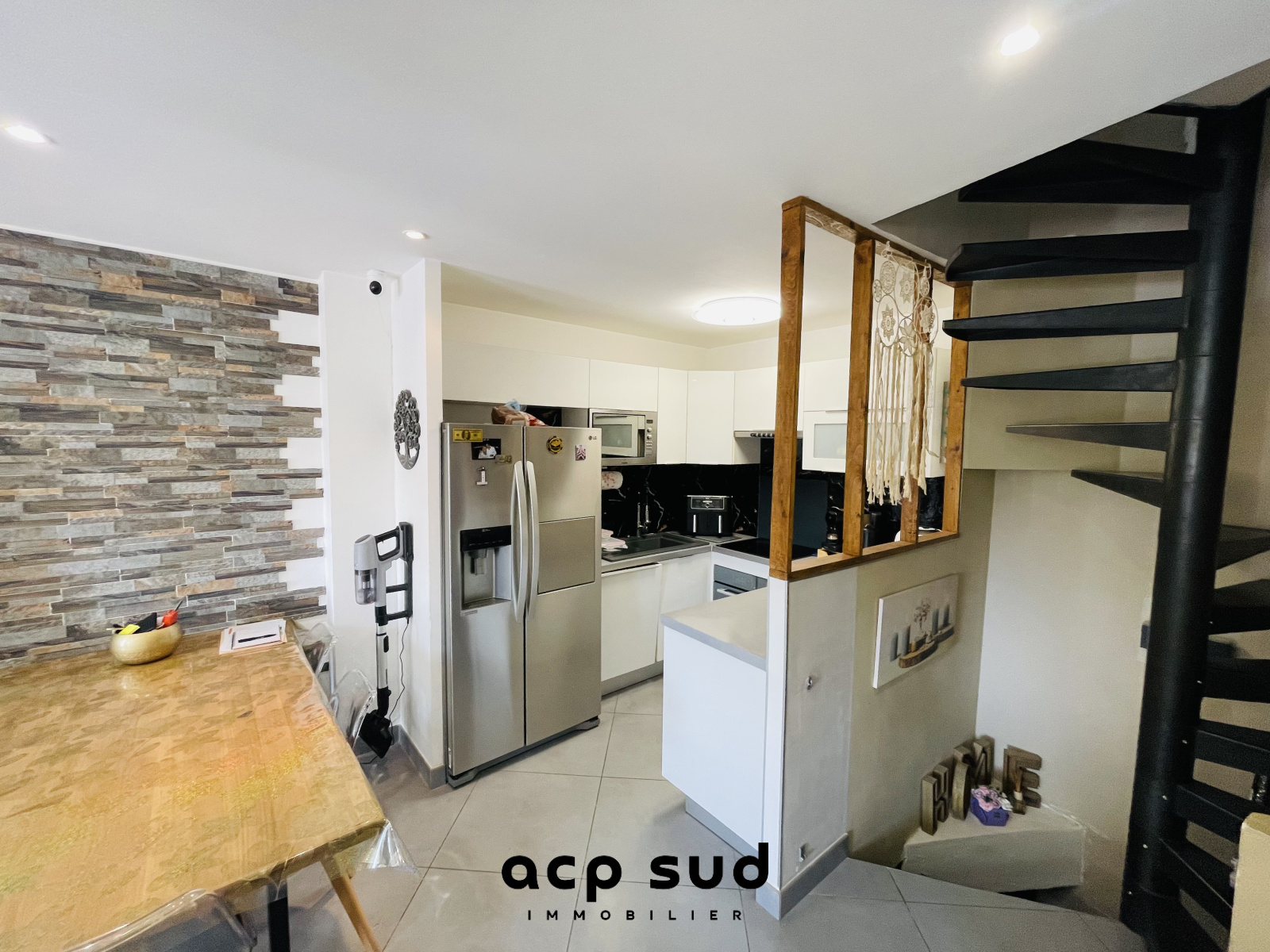 Au 1er étage, une pièce de vie avec cuisine US équipée et aménagée.
